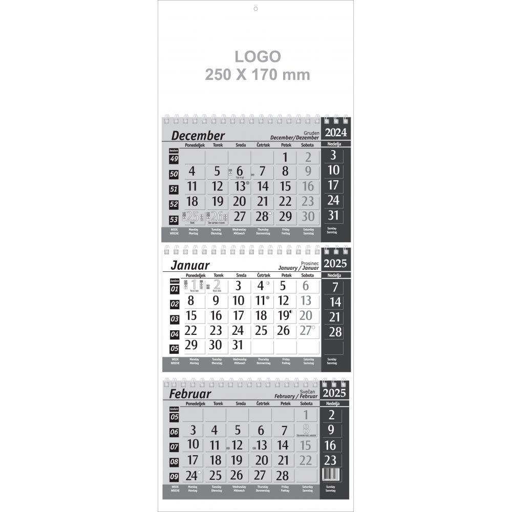 Stenski tridelni špiralni koledar v belo/sivi barvi 24,5 x 70 cm (prostor za logo 24,5 x 15 cm).